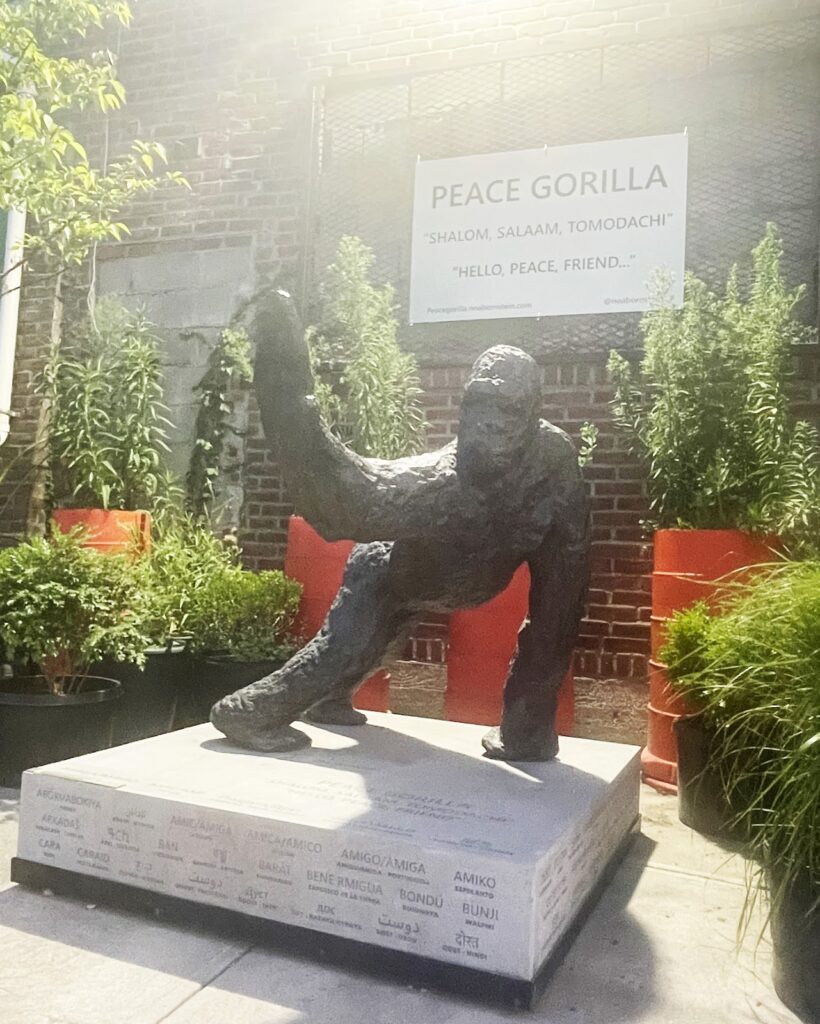 Peace Gorilla’s habitat since August 2023 is at Kingsland Wildflowers at Broadway Stages, 520 Kingsland Ave.in Greenpoint. Broadway-stages.com is NY’s premier film and television company, committed to community, sustainability and growth. Kingsland @Broadway Stages is also the home of the Newtown Creek Alliance who work to improve the health of the creek and our community; and of NOopshere Arts, the multi-disciplinary arts & culture partner at Kingsland, and of “Alive Structures,” the expansive greenroof gardens.